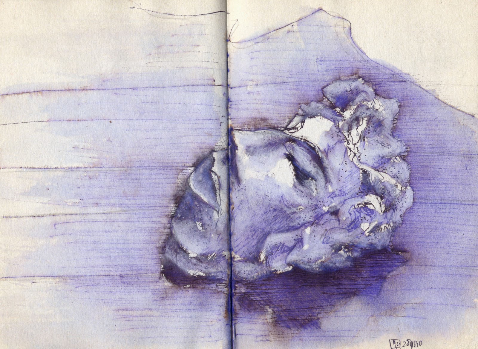 Een half vergaan porseleinen poppenkopje wat Ivo vond in een huis wat gerestaureerd moest worden. Ik vond het mooi, een beetje morbide wel. Het zou behoorlijk oud zijn, van één of ander duur poppenfabrikaat. Maar ik heb daar geen verstand van, vond het gewoon mooi verweerd.